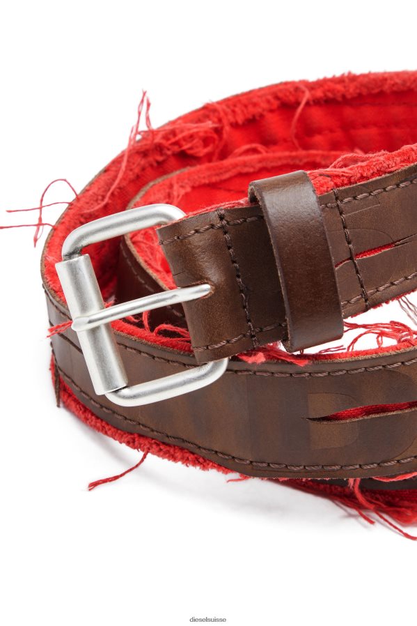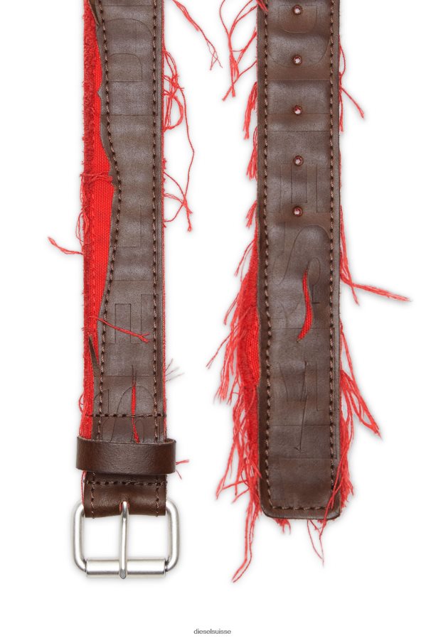 ceinture pour homme en toile traitée et cuir marron, coupée au hasard pour un look destroy. marqué avec un lettrage diesel intégral et fini avec une boucle en métal.