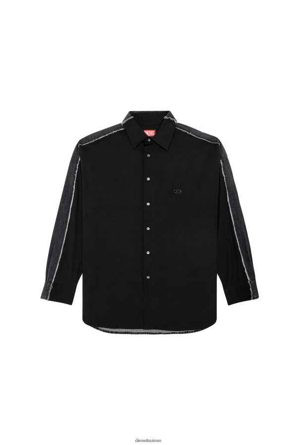 cette chemise pour homme est fabriquée à partir d'une combinaison de popeline de coton haute densité et de denim à bords bruts. coupe classique avec logo d ovale brodé en fil ton sur ton.