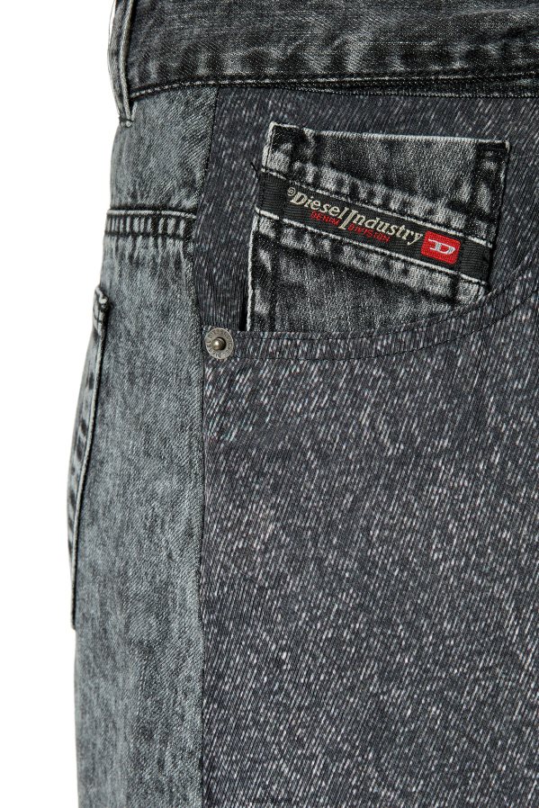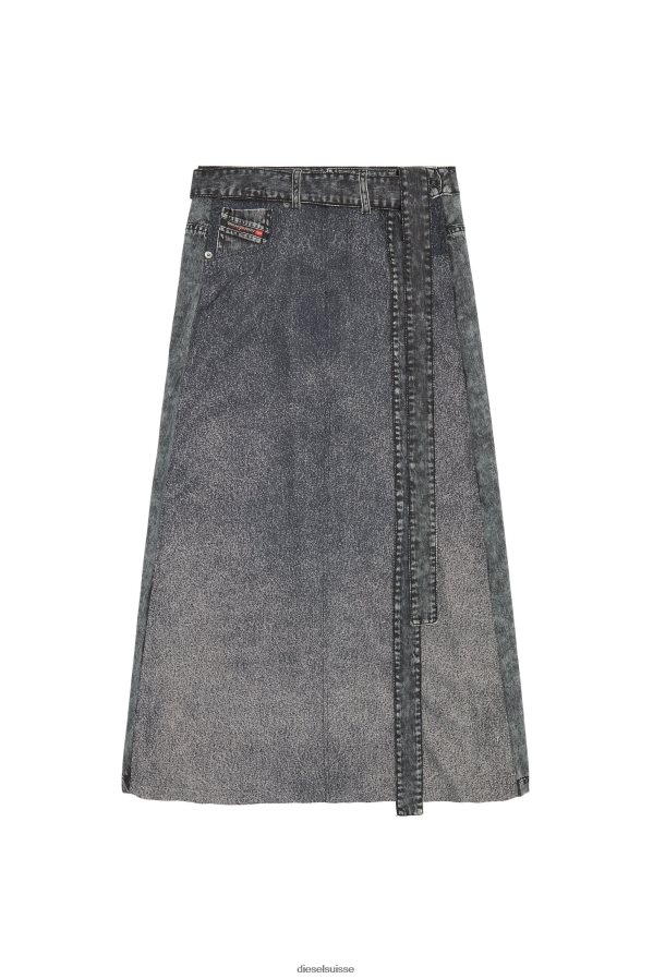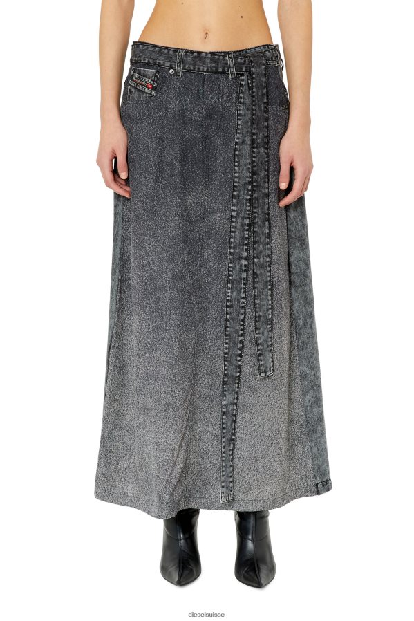 jupe longue coupe classique en sergé filé avec des fibres de viscose ecovero, imprimée numériquement pour un effet denim en trompe l'œil dans un délavage gris. stylisé avec une ceinture en jean et des attaches latérales, il présente le détail emblématique du drapeau de la cinquième poche de diesel.