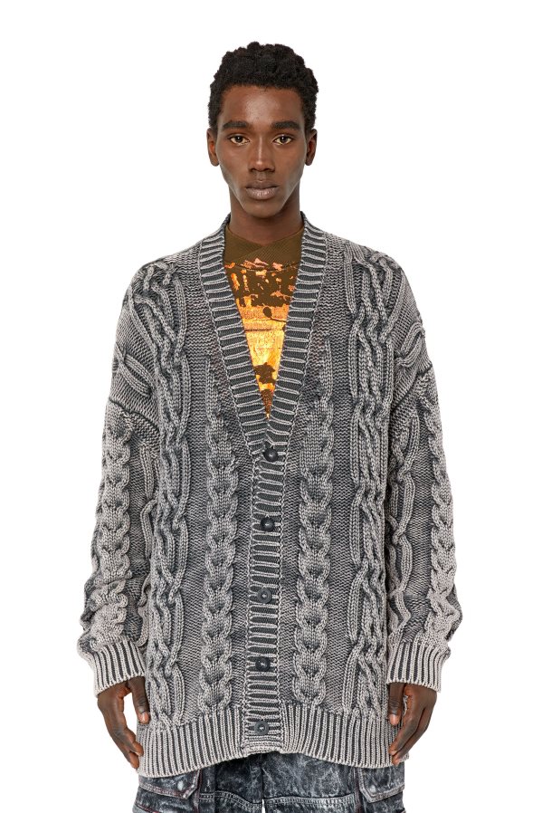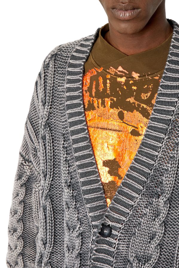 Mélange de mailles inversées et de grosses torsades, ce cardigan en coton pour homme a une coupe oversize et des boutons en fausse corne. l'imprimé logo rouge au dos ressort contre la teinte grise délavée.