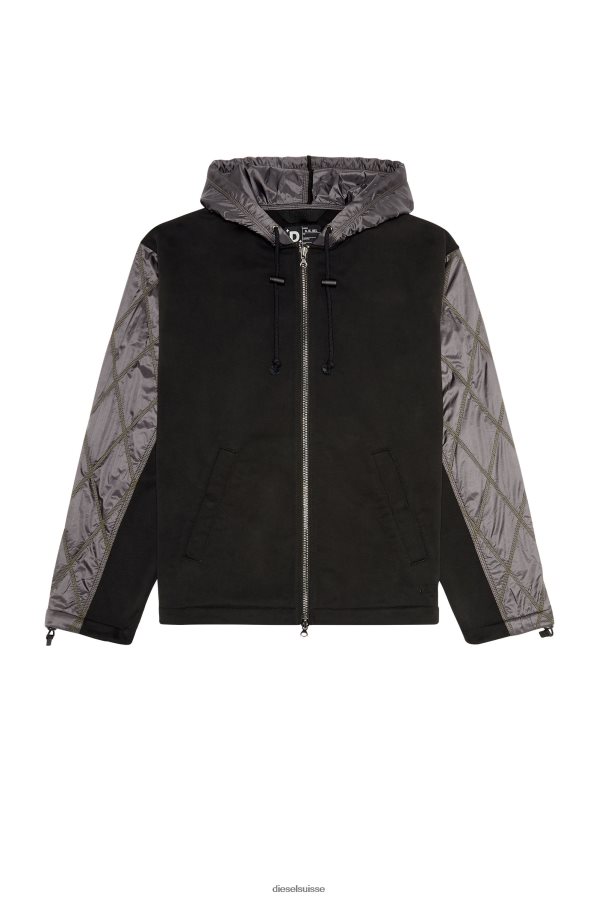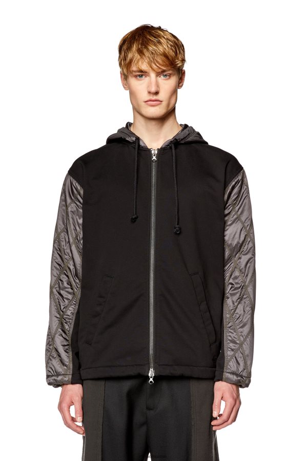 cette veste pour homme trouve l'équilibre entre un sweat-shirt et une doudoune. le blouson zippé est fabriqué à partir de molleton noir avec des manches en nylon matelassé super léger ton sur ton, et une capuche et un empiècement en nylon lisse. fini avec des cordons de serrage à la capuche, aux poignets et à l'ourlet, et un logo d.ies.el brodé.